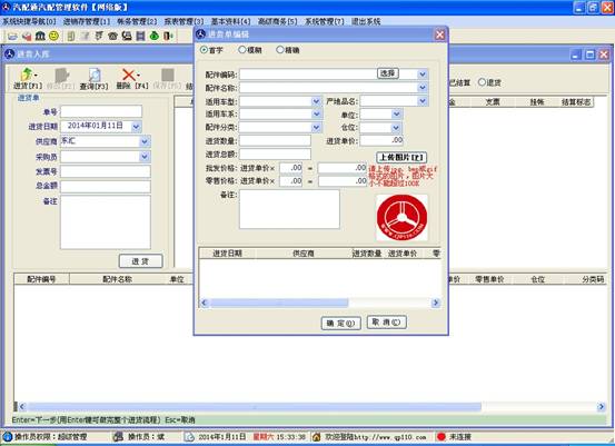在左側(cè)輸入供應(yīng)商后,點(diǎn)擊“進(jìn)貨”按鈕,打開配件資料錄入窗口如下圖
