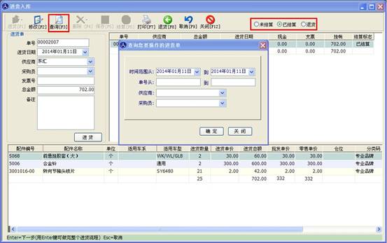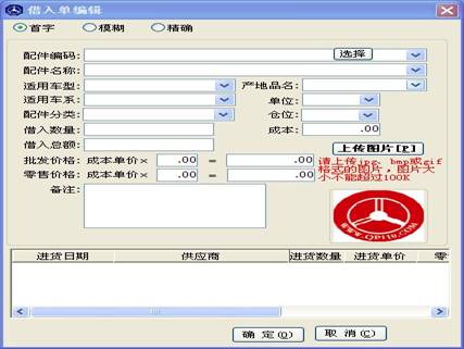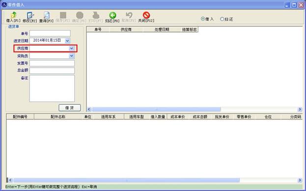 配件借入操作與配件入庫(kù)操作近似,在供應(yīng)商處輸入商家名稱,點(diǎn)“借貨”按鈕