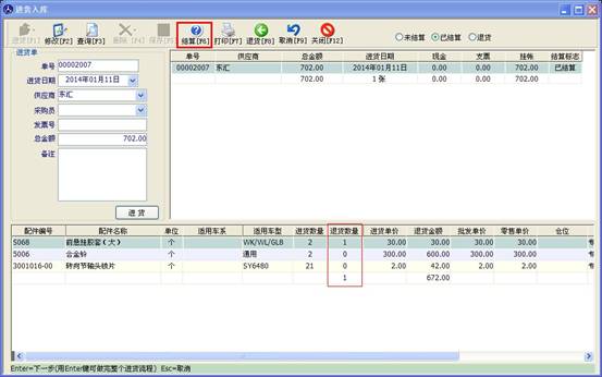 找到要退貨的配件,輸入退貨數(shù)量,再點(diǎn)上方的結(jié)算按鈕即可完成退貨。