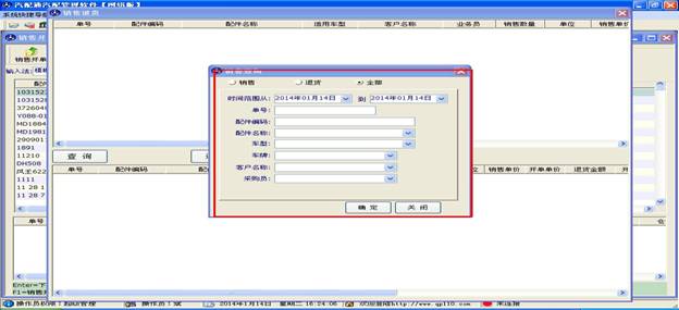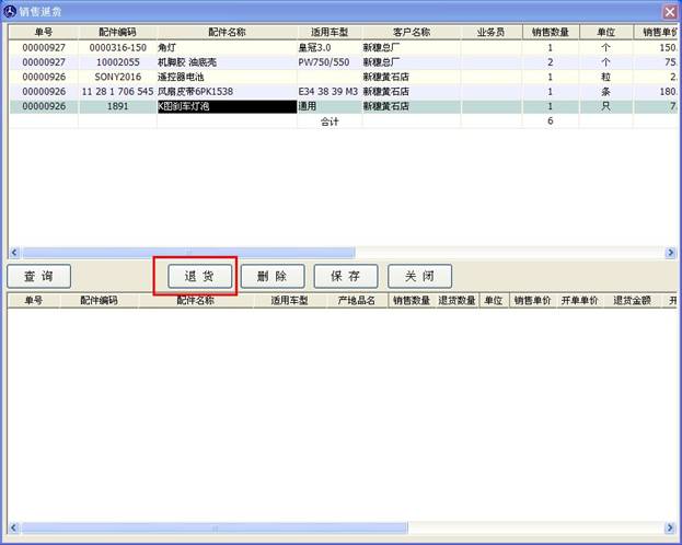 先使用查詢功能找到您要退貨的單子,如果您不記得單號(hào)可以根據(jù)時(shí)間范圍來查詢。查詢出某時(shí)間段的銷售后,選擇您要退貨的配件,點(diǎn)擊“退貨”按鈕,如下圖。