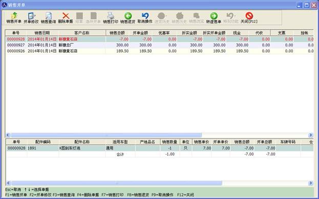 窗口分為上下兩部分,上部分顯示的是開出的單子及客戶一些信息,下部分對(duì)應(yīng)的是此單子里包含的配件信息。