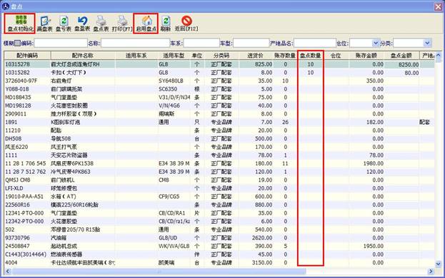 點(diǎn)擊上圖(圖2.3.1)中的“盤點(diǎn)”按鈕,進(jìn)入盤點(diǎn)窗口,如下圖(2.3.1.1),初次盤點(diǎn)請(qǐng)點(diǎn)擊“盤點(diǎn)初始化”按鈕,點(diǎn)擊后下放的表格將會(huì)列出您所有的庫(kù)存。如果某個(gè)配件庫(kù)存數(shù)量不正確,您可以在“盤點(diǎn)數(shù)量”那列填寫正確的數(shù)量,庫(kù)存數(shù)量正確的配件可不填寫。盤點(diǎn)數(shù)量是即時(shí)保存的,當(dāng)您的配件數(shù)量過多時(shí),一天沒有盤完,可以第二天再繼續(xù)盤,但第二天打開盤點(diǎn)是,請(qǐng)不要點(diǎn)擊“盤點(diǎn)初始化”,要不然前一點(diǎn)盤點(diǎn)的數(shù)據(jù)就清空了。當(dāng)盤點(diǎn)完之后,點(diǎn)擊“啟用盤點(diǎn)”按鈕,庫(kù)存數(shù)量將會(huì)變成您盤點(diǎn)后的數(shù)量。