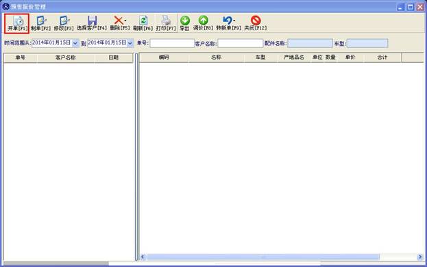 當(dāng)您的客戶到您這進(jìn)貨需要一批配件的進(jìn)貨明細(xì)及價(jià)格時(shí),您就要使用到報(bào)價(jià)單。點(diǎn)擊軟件左面版的報(bào)價(jià)單制作打開預(yù)售報(bào)價(jià)管理窗口,如下圖(2.4.1)。