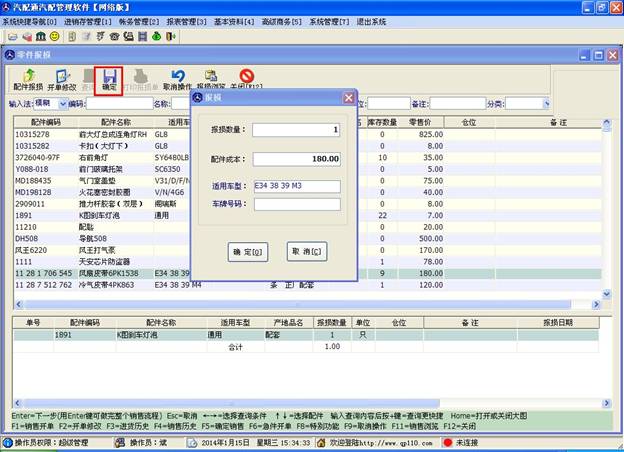 打開配件報(bào)損窗口,找到要報(bào)損的配件,雙擊,輸入報(bào)損數(shù)量點(diǎn)確定,最后再點(diǎn)擊下圖標(biāo)記出來的“確定”按鈕,在彈出來的報(bào)損編輯窗口中輸入相關(guān)信息。