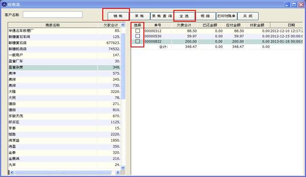 銷帳操作即您已經(jīng)收到這筆款項(xiàng)或者一部份款項(xiàng),操作如下,如下圖,如果商家一次性全款付清,您可以點(diǎn)擊全選,然后點(diǎn)銷帳就完成了。