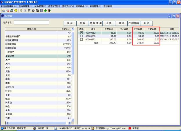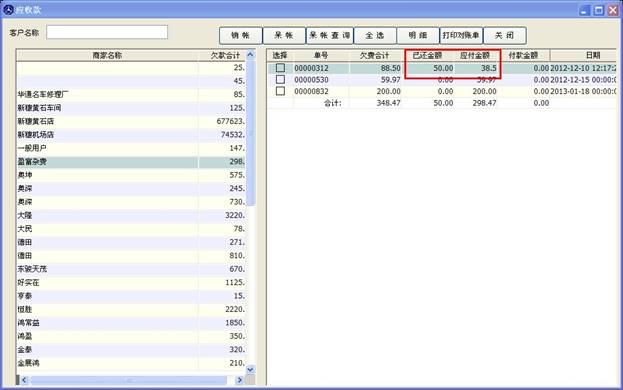 打開應(yīng)收款窗口,如下圖,左邊是商家名稱及欠款合計(jì),當(dāng)您點(diǎn)擊左邊的某條信息時(shí),右邊的表格會(huì)顯示出其應(yīng)付或應(yīng)收的單子列表