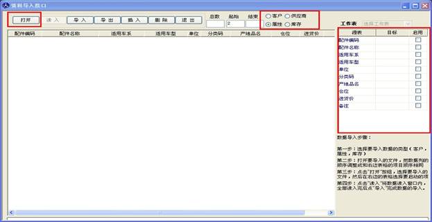 數(shù)據(jù)導(dǎo)入導(dǎo)出可以將您保存在電腦上的excel 文件 導(dǎo)入到軟件里,此窗口支持導(dǎo)入的有客戶資料導(dǎo)入,供應(yīng)商導(dǎo)入,屬性導(dǎo)入和庫(kù)存導(dǎo)入,如下圖。四個(gè)類型的導(dǎo)入操作都一樣,現(xiàn)在我們以屬性導(dǎo)入為例進(jìn)行講解。